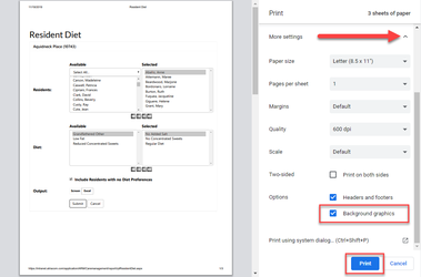 Step 2: In the resulting print preview window, select the More Settings dropdown option. Scroll down to Options and check the Background Graphics box. This enables resident profile pictures to print with the report. Then, click Print.