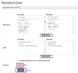 Step 4: When the desired selections have been made, click Submit. The Resident Diet Preferences should now be displayed further down the page.