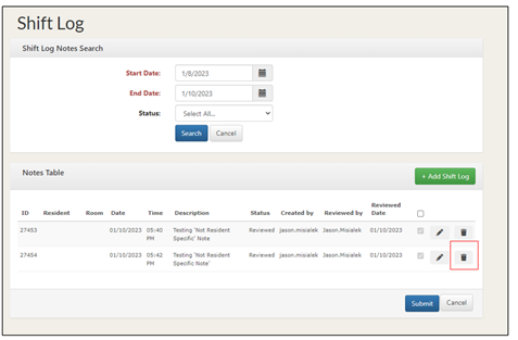 Step 1: After submission if there is a note that needs to be removed, after searching for shift log notes select the Trash Can icon next to the note in question.