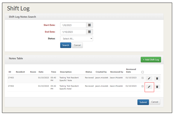 Step 1: After submission if there is a note that needs to be edited, after searching for shift log notes, select the 'Pencil Icon’ next to the note in question.