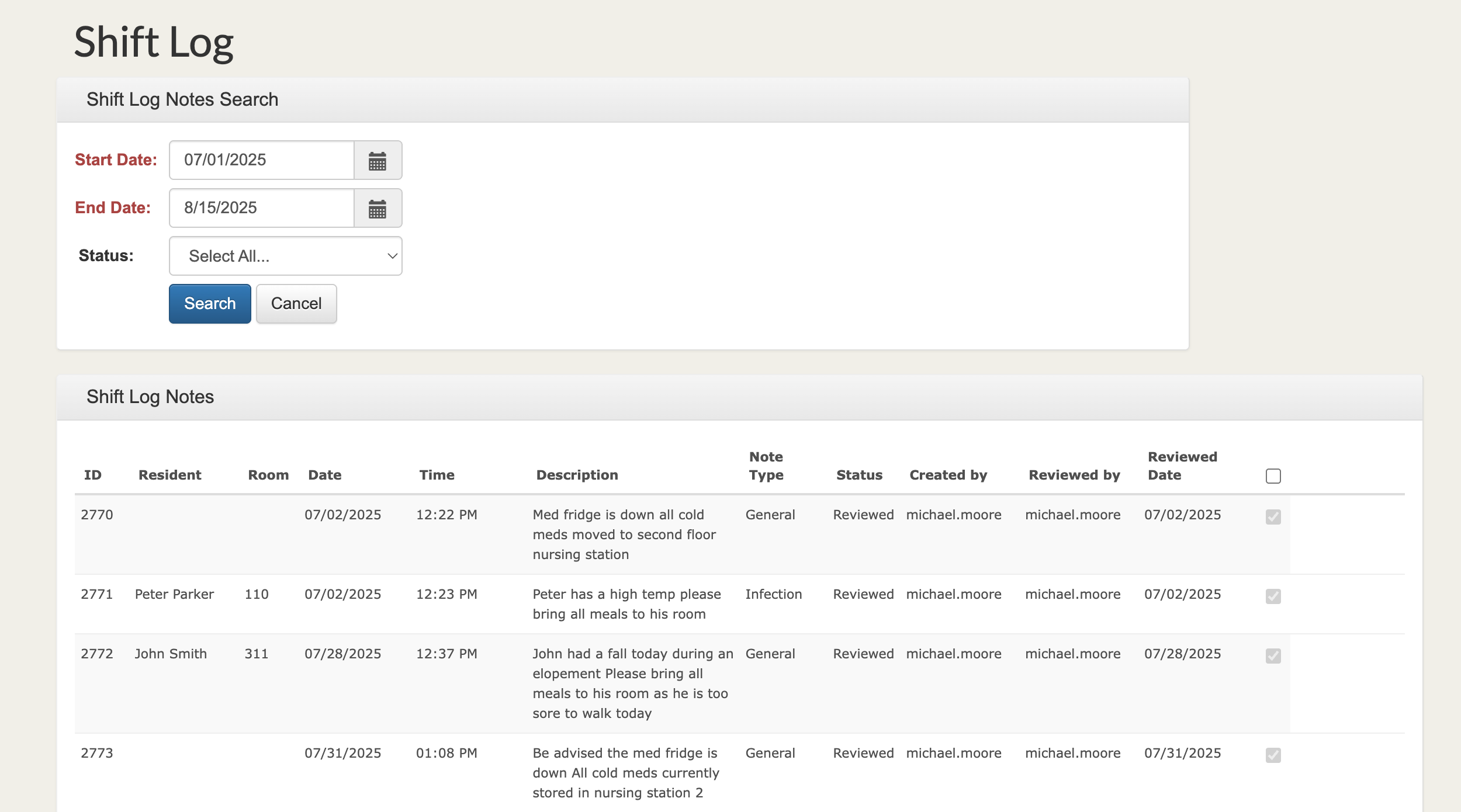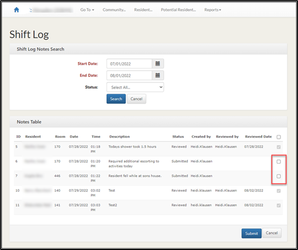 Step 1: After searching for shift log notes, select any notes to mark as reviewed by selecting the checkbox to the right of the note.