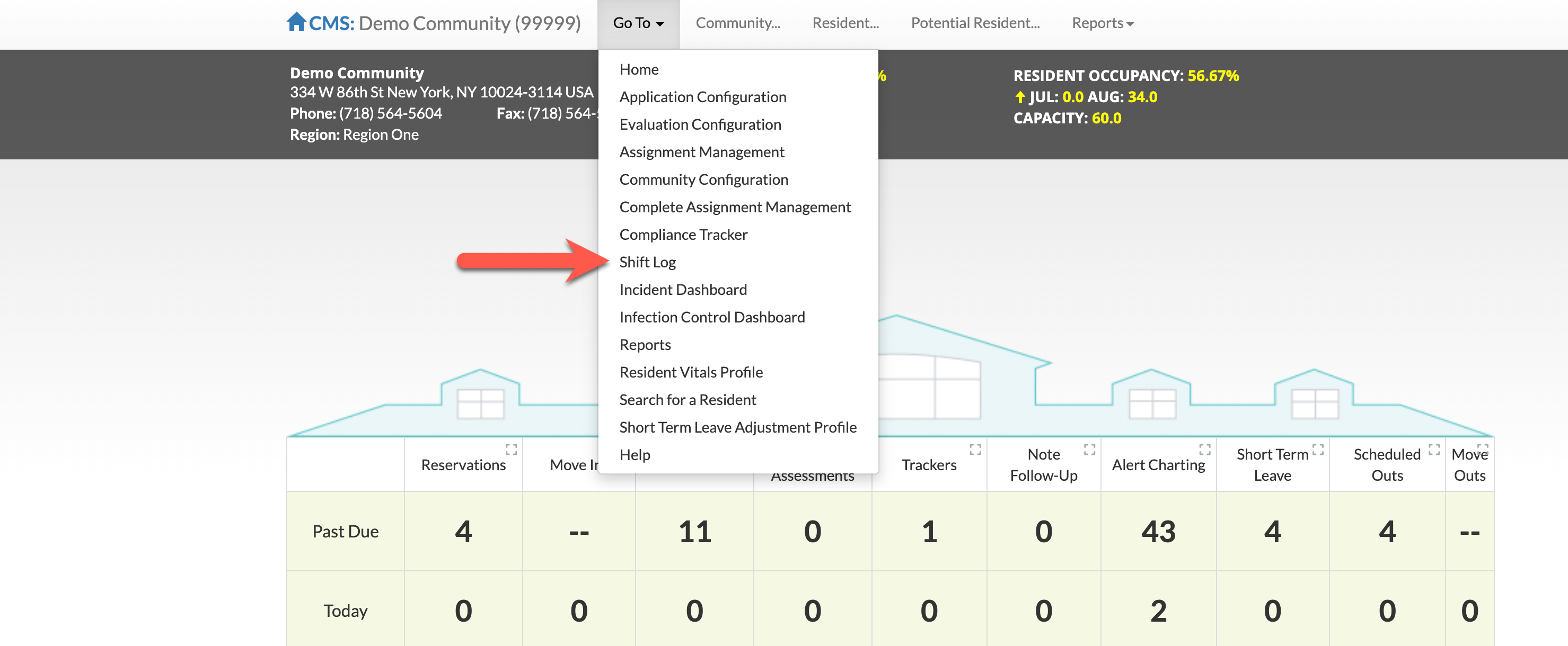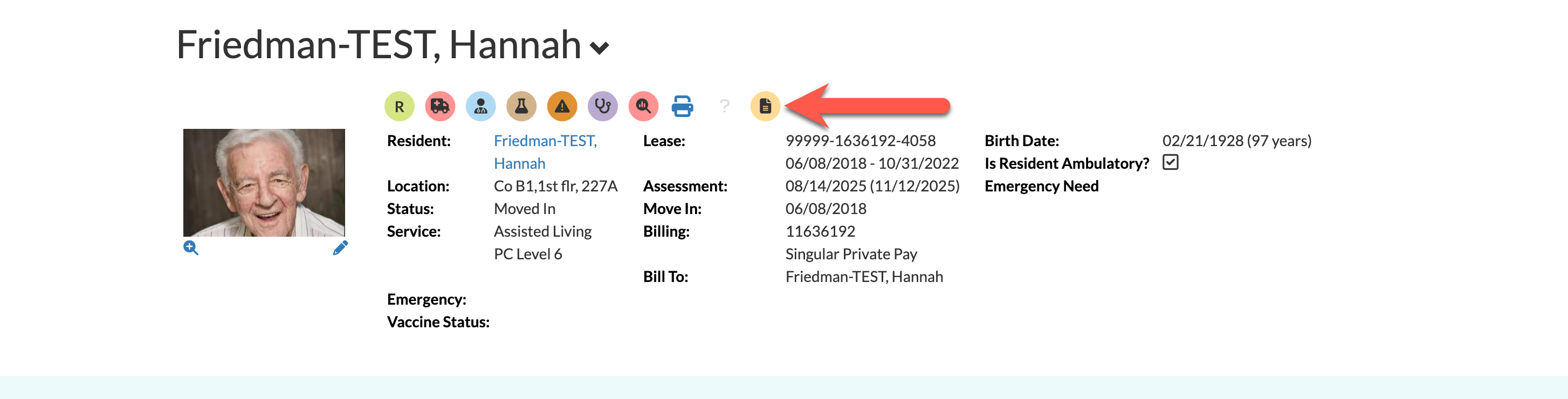 A shortcut to view Shift Logs related to a specific resident can be found on each resident profile at the top of the page. Selecting the Clipboard icon will take users to the Shift Log tool and display only logs that pertain to the selected resident.