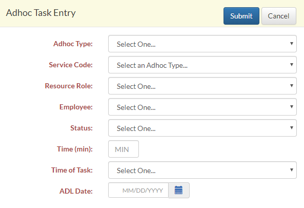 A modal window will appear. Choose an Adhoc Type (either Community Task or Resident Task). If Resident is chosen, a resident dropdown will appear, and a resident must be chosen. Fill out the remaining fields and click Submit in the top right corner to submit the Adhoc task.