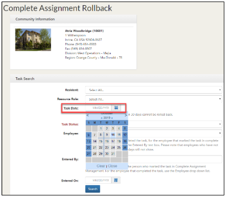 Step 3: Set up the Task Search to find tasks to reactivate for the assignment sheet. Click on the task date calendar and choose the date the tasks were scheduled to be completed.