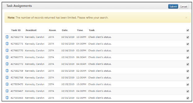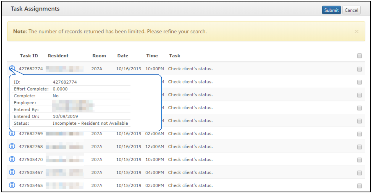 Step 4: You search results will list any tasks that were completed on that date. To review when the tasks were completed and who entered them into Complete Assignment Management, hold your cursor over the blue information button on the left-hand side of the list of tasks.