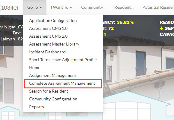 Step 1: On the Care Management Home page, click on the Go To dropdown in the top left and select the Complete Assignment Management option to navigate to the new task completion page.