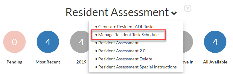 - Choose the resident you want to work with in Care Management and go to the Resident Assessment part of the page and choose the option of Manage Resident Task Schedule from the dropdown menu.