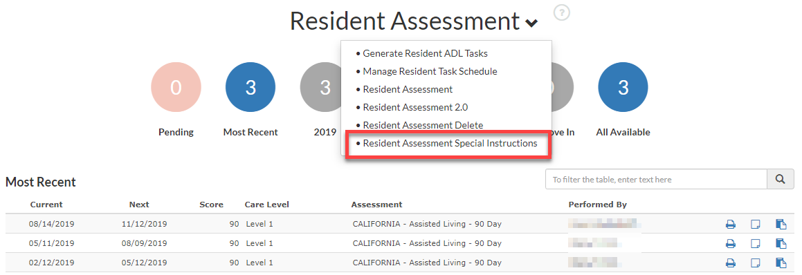 Step 3: From the Resident Assessment drop down, choose the Resident Assessment Special Instructions.