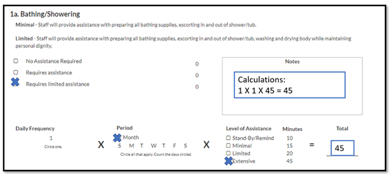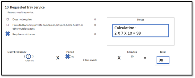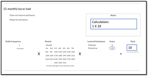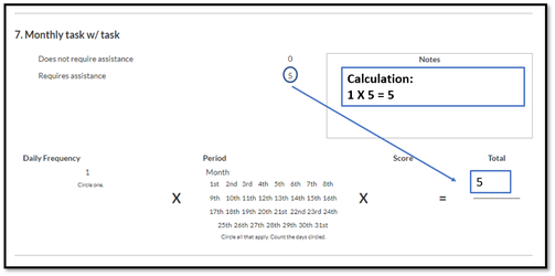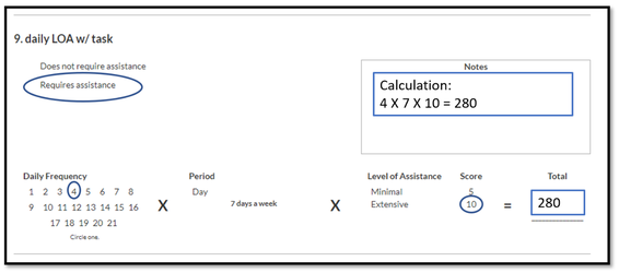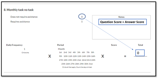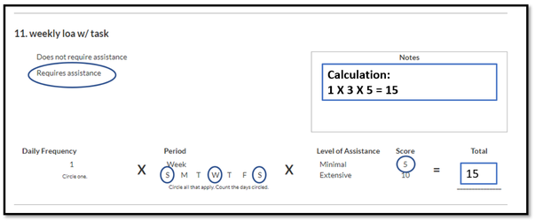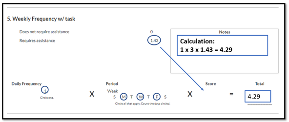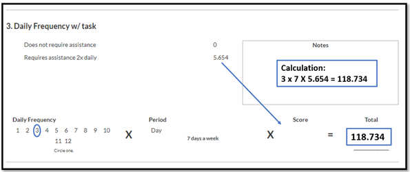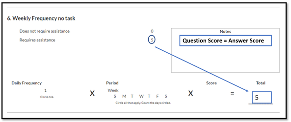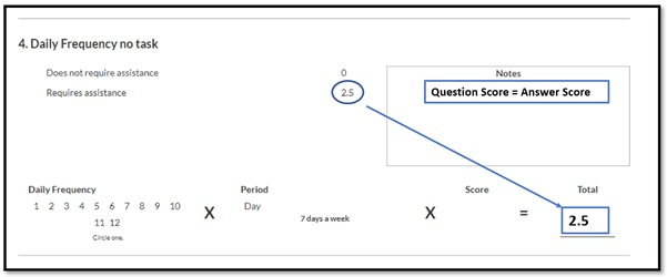 Question Score = 1 time per day x # of days per week x Selected Level of Assistance Score