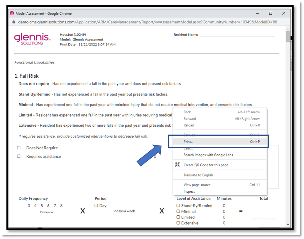 Note: When performing the assessment, make sure all questions are answered. Once the questions in the Model Assessment are complete, the assessment score or minutes must be added up. Make sure to perform all calculations prior to calculating the final score.
