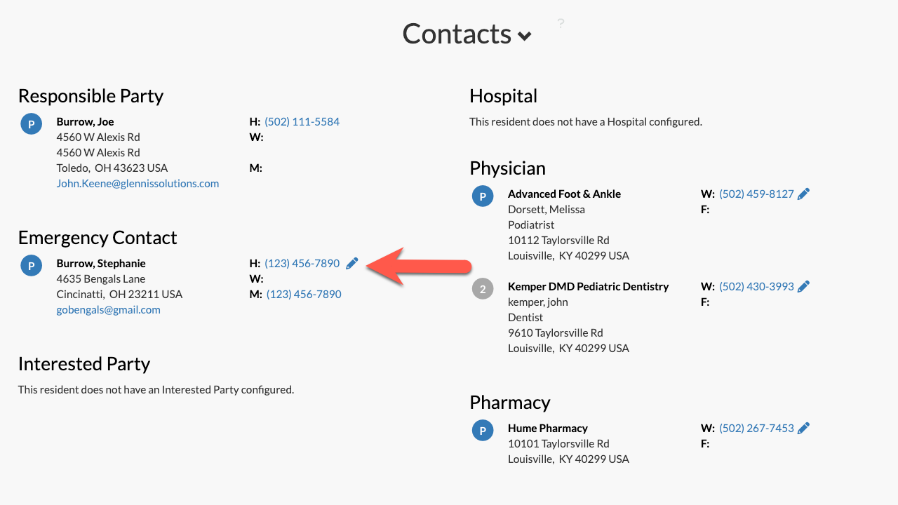 Step 1: On the resident’s profile page in Aline Care, scroll down to the Contacts section at the bottom of the page.