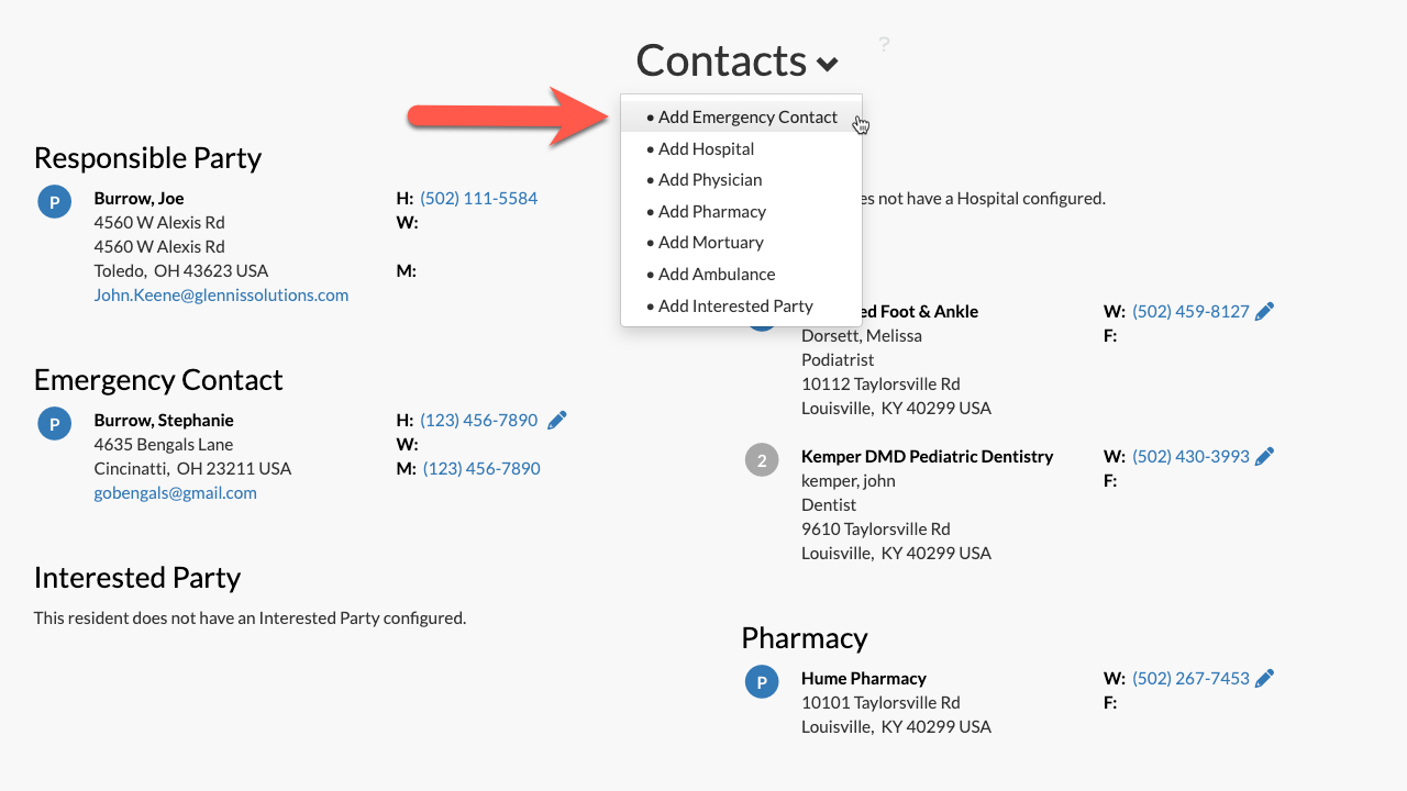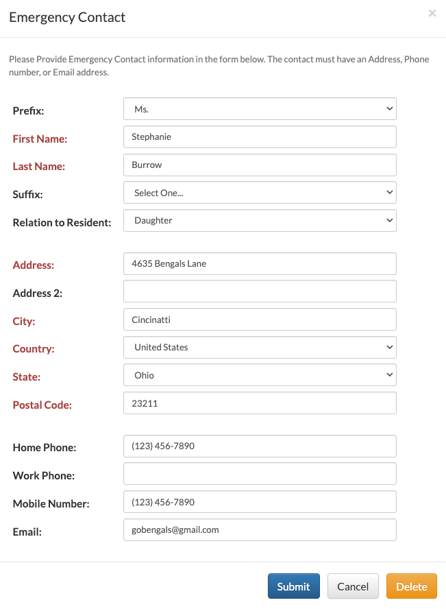 Step 4: Here, you can add or edit the resident’s emergency contact information. Emergency contacts can also be deleted by selecting the "Delete" button.