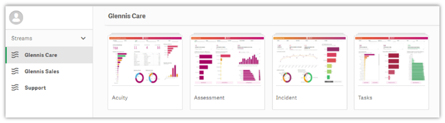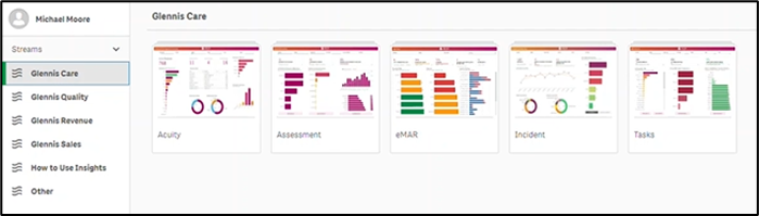 To access the Aline Care Stream, select Aline Care from the left panel. Each Aline Insights Stream will contain multiple Apps. As seen below, users have access to the five Care apps: Acuity, Assessment, eMAR, Incident, and Tasks.