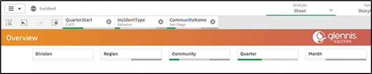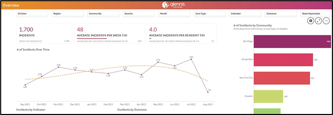 Users can navigate over to the Overview Sheet to see the total number of incidents along with the total number of resident incidents in the communities across the organization. Also displayed are the average incidents per week and the average incidents per resident. The graph will display the number of incidents by community whereas these two visualizations on the right will breakdown incidents by indicator and incidents by outcome. Users can further drill this data down to specific regions or communities by using the filter pane at the top.