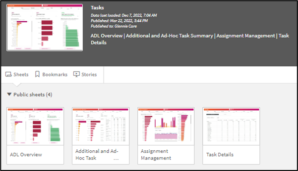 The Tasks App offers users an overview of tasks in their community. This app contains four sheets: ADL Overview, Additional and Ad Hoc Tasks, Assignment Management, and Task Details. These sheets can be used to answer the following questions: