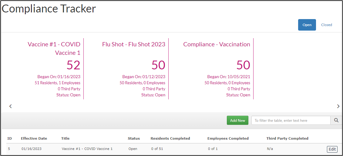 Open trackers that need to be completed will display on the top of the page. Select Edit to begin tracking resident and employee completion.