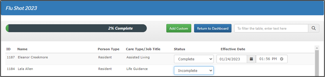 Updates are automatically saved, and the progress bar is adjusted with each employee or resident status update.