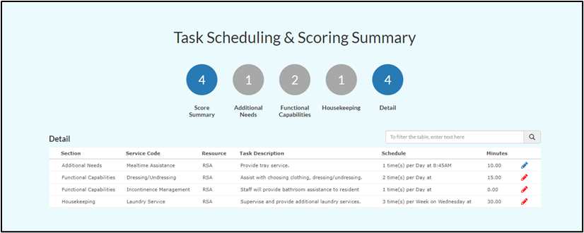 Care tasks in the Care application are generated from a resident’s assessment. After assessing a resident, community leadership will schedule all resident care tasks generated by the assessment. Users do this by selecting the red edit pencil beside the task. The pencil turns blue when the task schedule is complete.