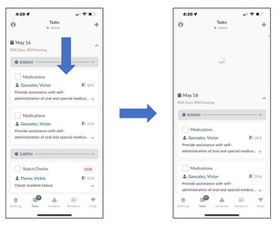 If a Resident care schedule change is made in CMS that results in a new or modified task, the task list can simply be refreshed while the device has connectivity (internet/Wi-Fi).