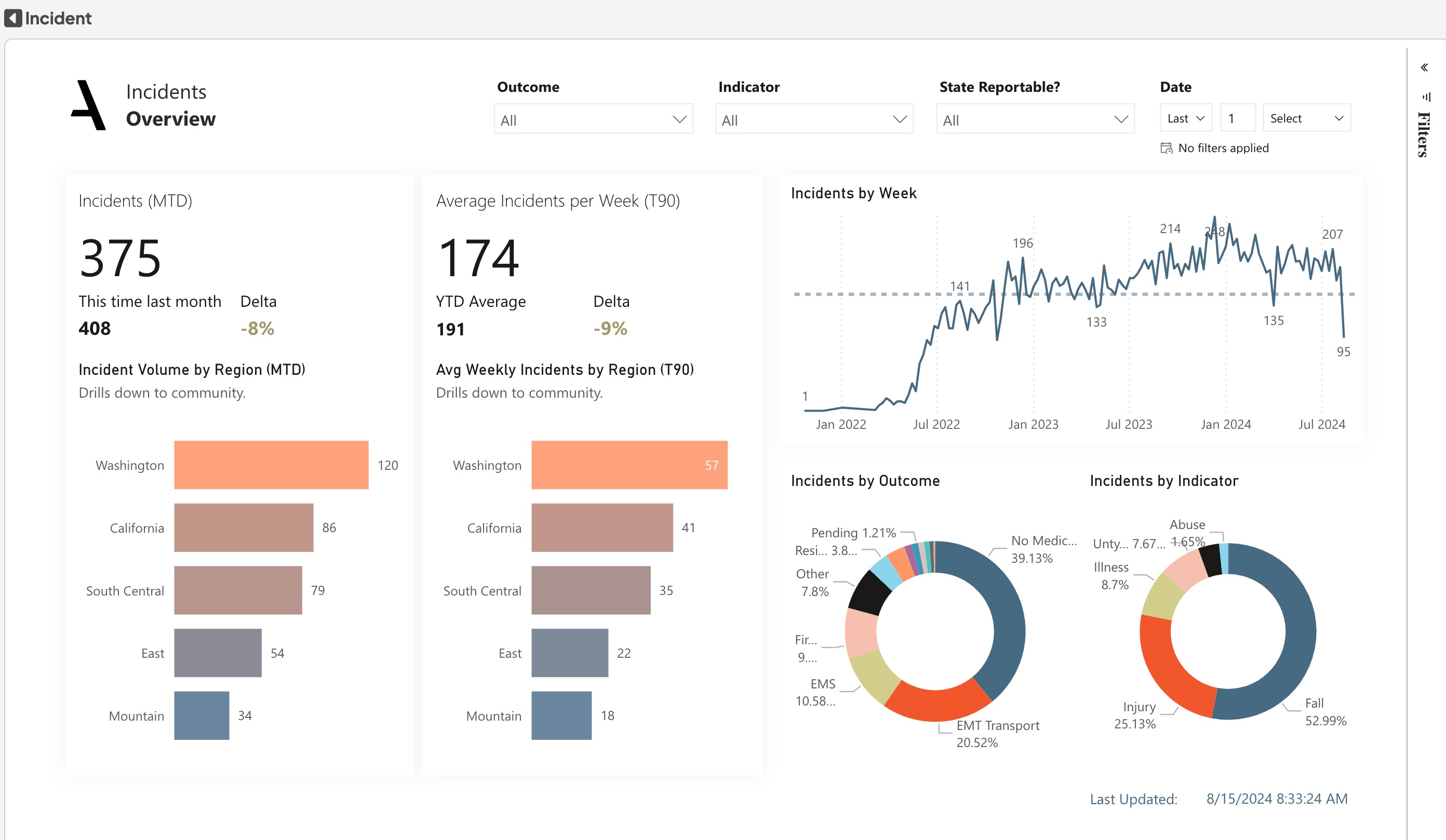 Look at a trend chart of incidents over time to identify any patterns or recent changes broken down by week and day. In the pie charts, discover insights about common Incident types and outcomes.
