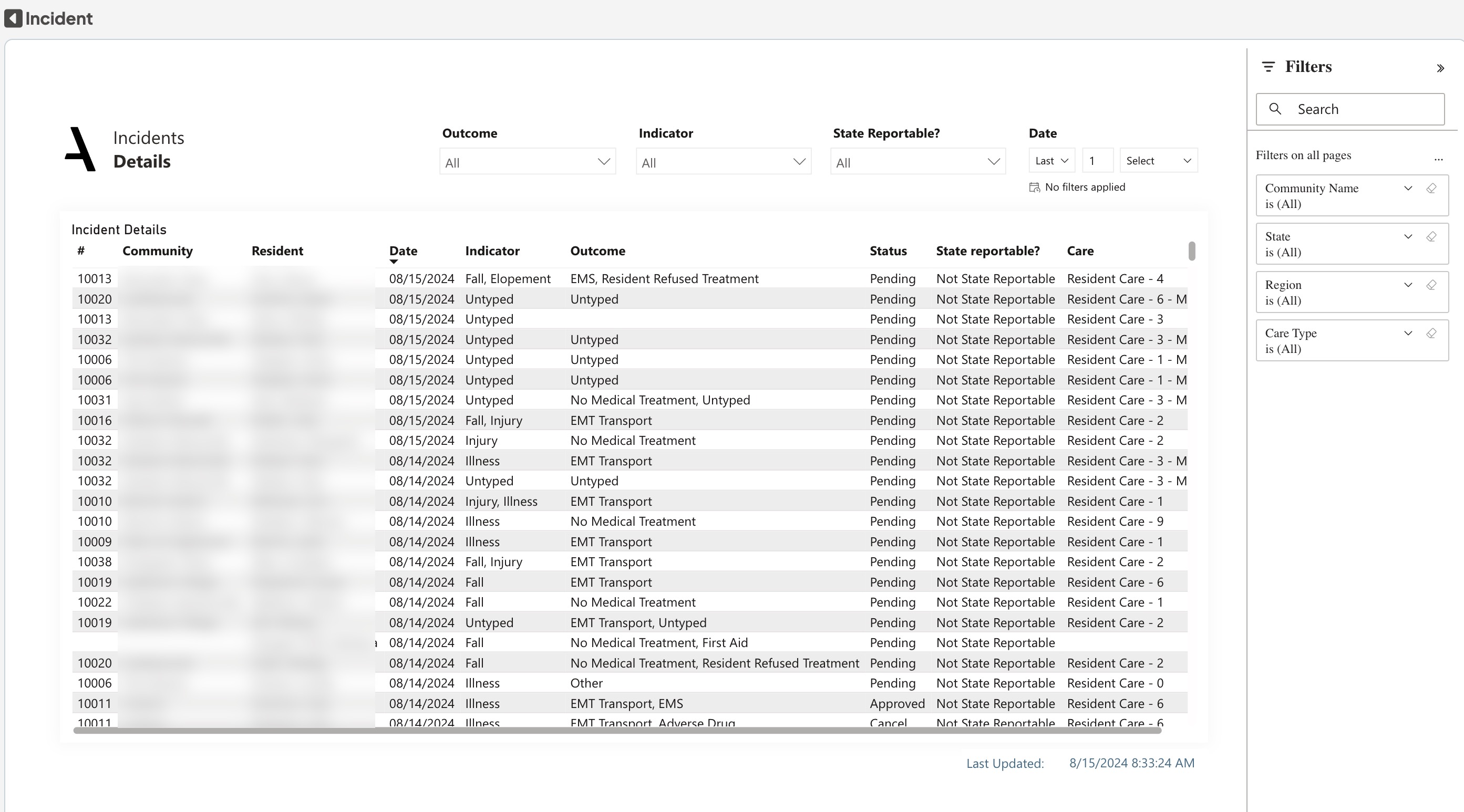 Use the Details table to access the information about each resident and incident. The table includes Community Number, Community Name, Resident Name, Date, Indicator, Outcome, Status, State Reportable, and Care Level.