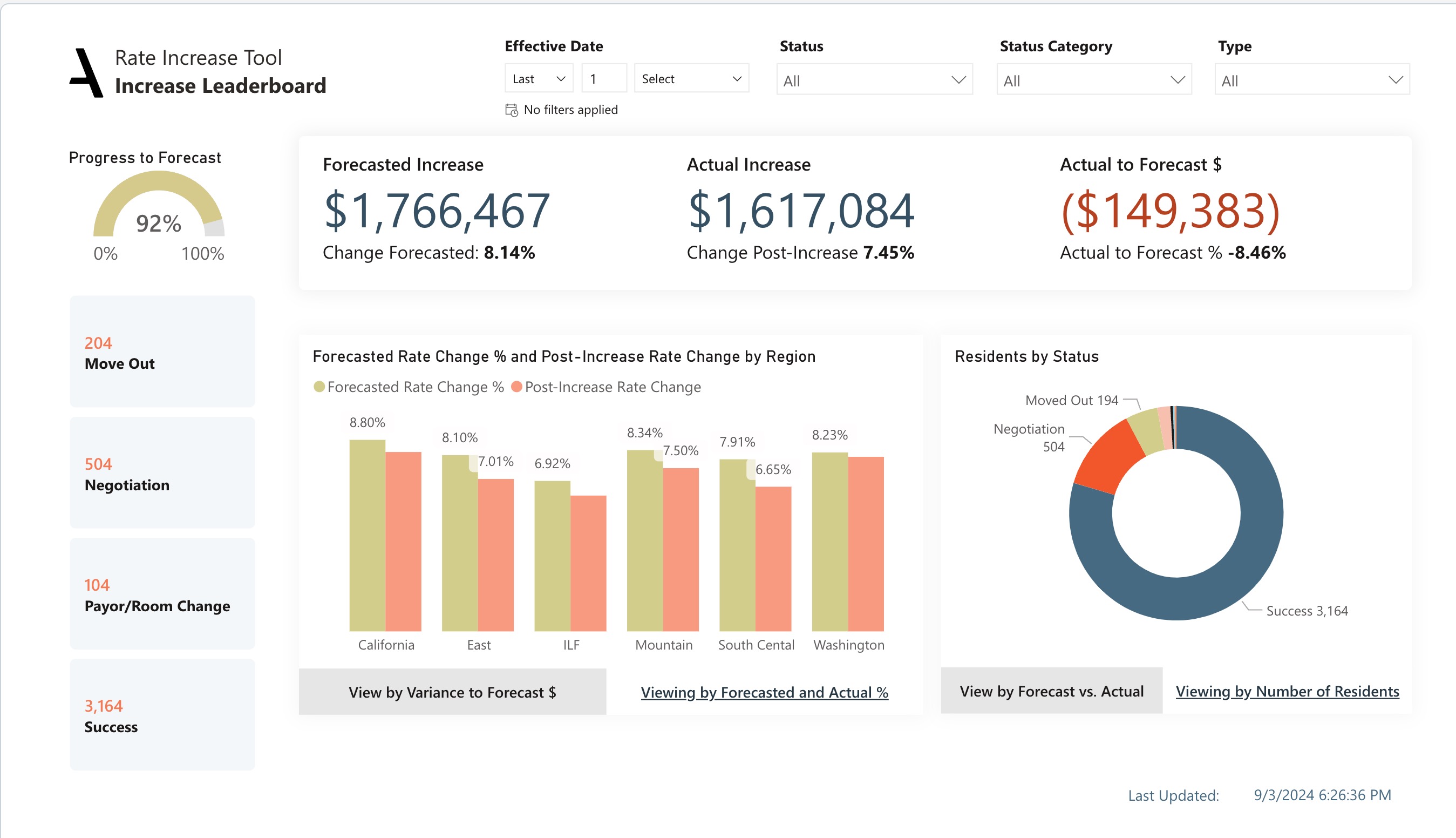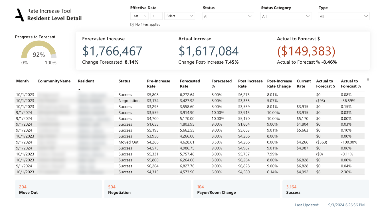 Understand the state of rate increase progress through critical KPls, such as the variance between forecasted and actual increases, offering a clear picture of financial expectations versus reality. Understand the increase/decrease progress through KPls, such as the Move Out, Negotiation, Payor/Room Change and Success.