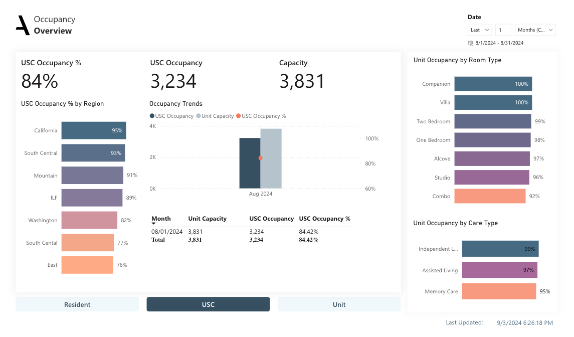 • Unit Occupancy %: Intended to give a clear and simple metric that represents the proportion of available units that are currently occupied in a community.