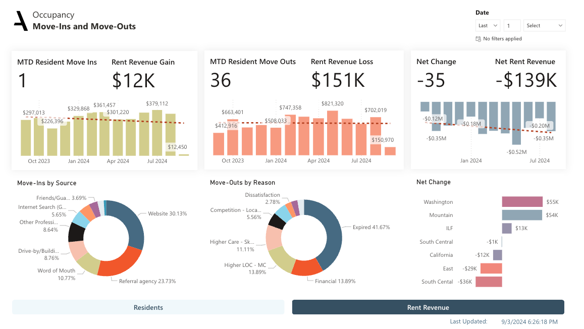 • The Move-Ins Bar chart indicates the expansion of resident numbers (MTD Resident Move-Ins) and the matching increase in rental revenue (Rent Revenue Gain) throughout time period.