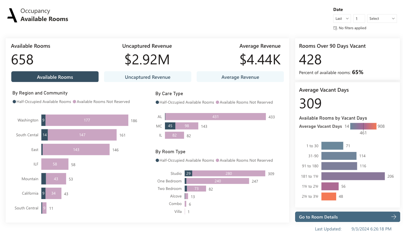 • The interactive buttons enable users to shift perspectives between Available Rooms, Uncaptured Revenue and Average Revenue targeted analysis and informed decision-making for optimizing resident management and capacity planning.