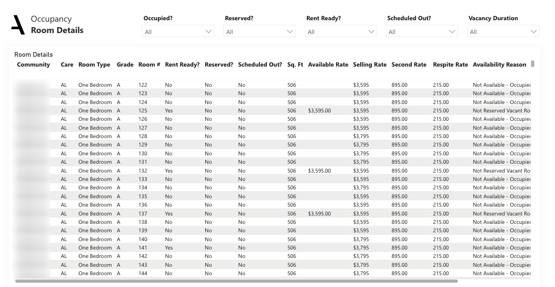 The Room Details table is a comprehensive dataset that provides essential information about each room within the Community and the columns used in the detailed table are Community, Care Type, Room type, Grade, Room Number, Rent Ready or not, Is reserved, are of the room, available rate, selling rate, second rate, respite rate and availability reason.