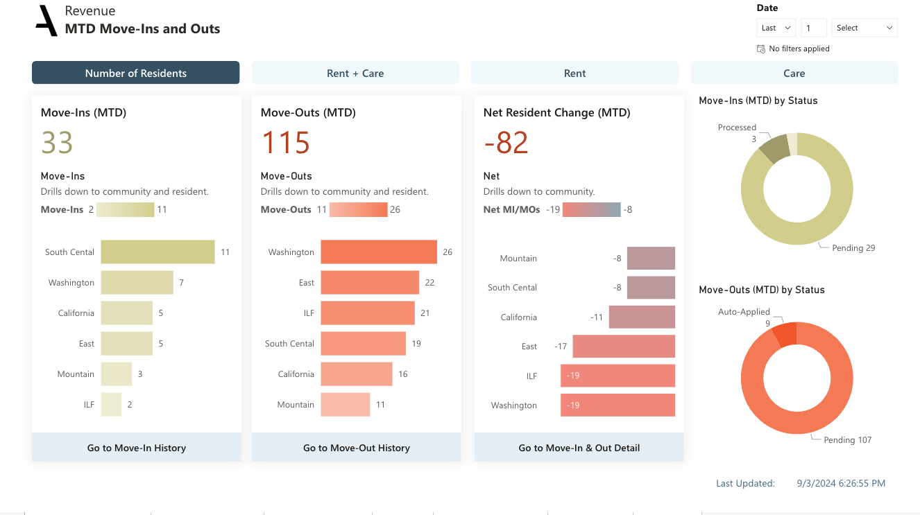 • The buttons above the KPIs allow you to toggle the measure between number of residents, total revenue, care revenue, and rent revenue. Or, in the case of move-outs, revenue loss.