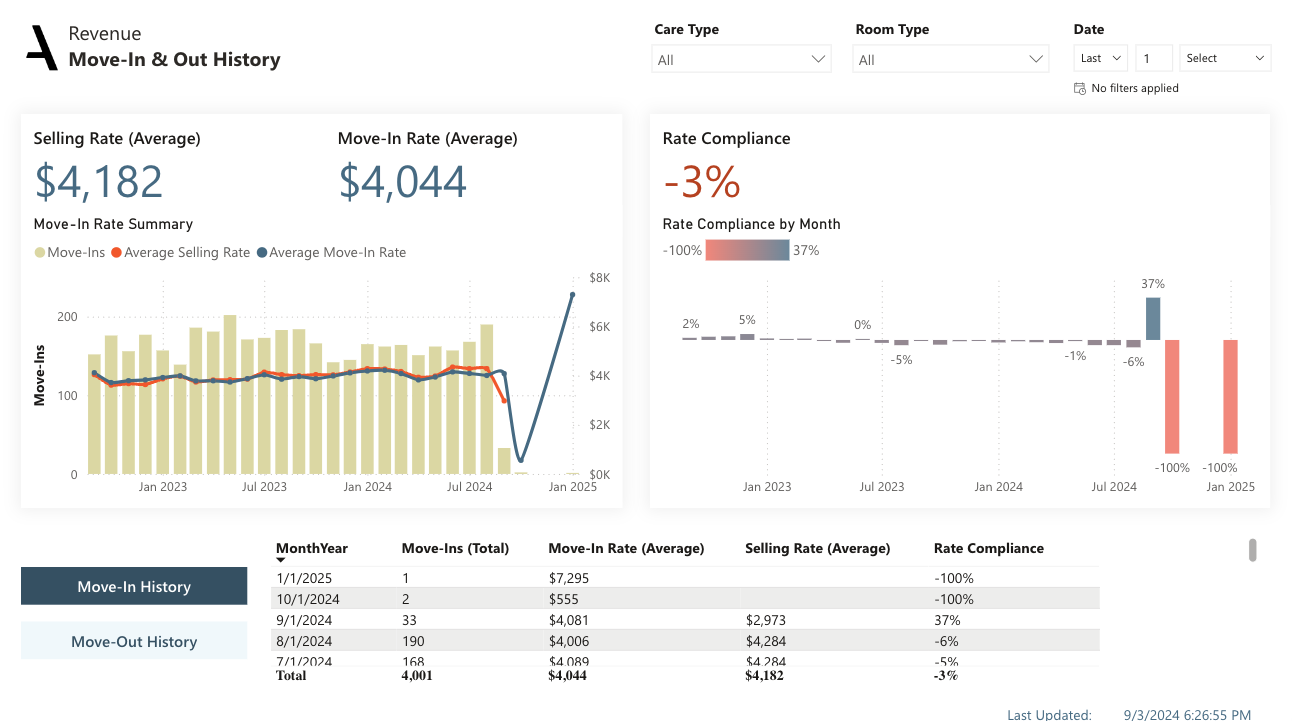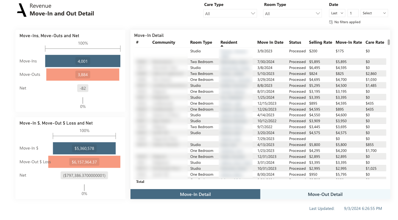 • Explore detailed tables showcasing individual move-in and move-out events, inclusive of community, room type, resident, date, and rates
