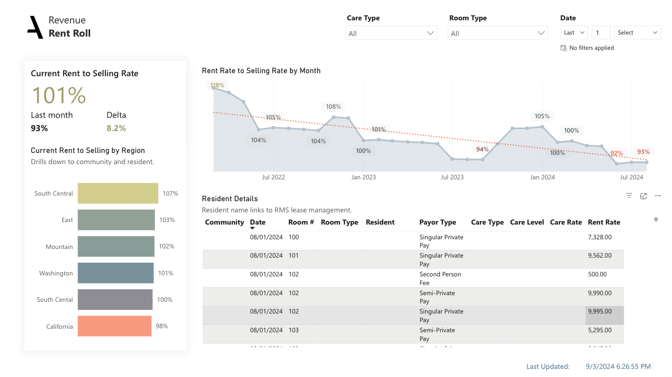 • Current Rent to Selling Rate: The variance between the current rent and the selling (market) rate, accounting for the different rates for different payor types.