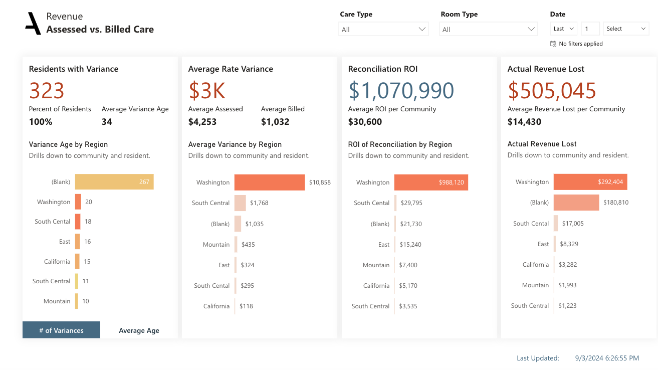 • The next section to the right provides insight into the average dollar variance per resident, with a bar chart showcasing total assessed and billed rates at a community level