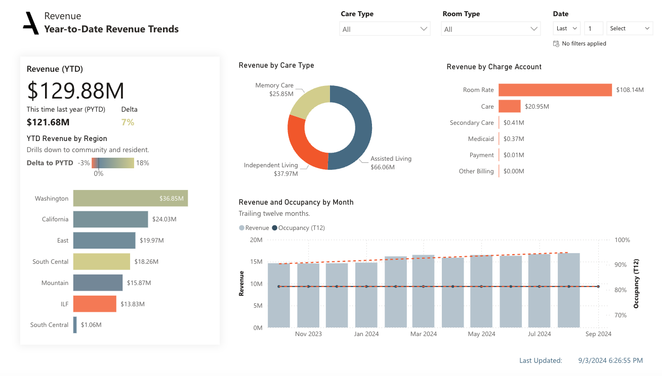 • The Revenue Trends sheet offers a comprehensive view of year-to-date revenue across different parameters including building, care type, and revenue type.