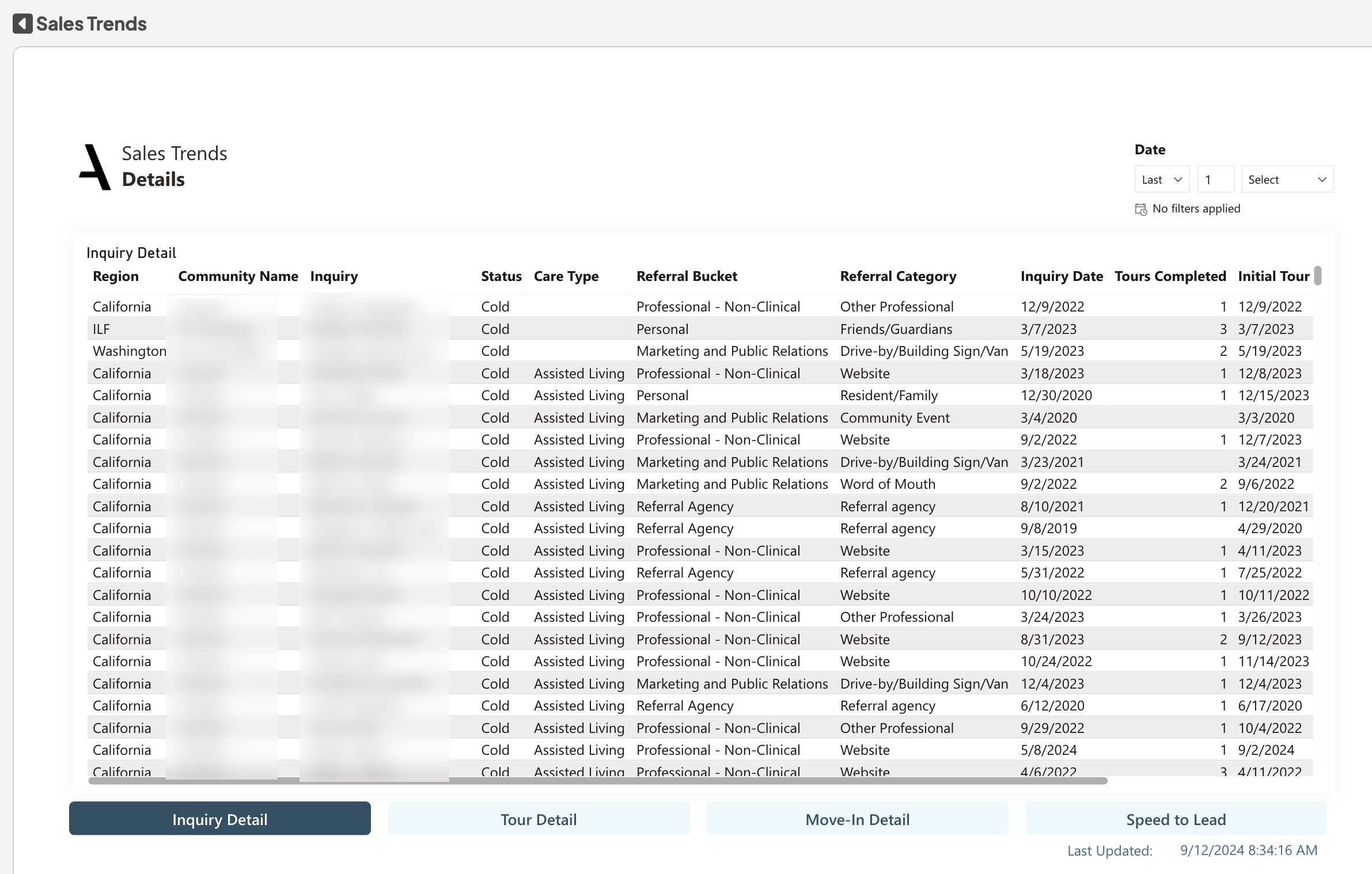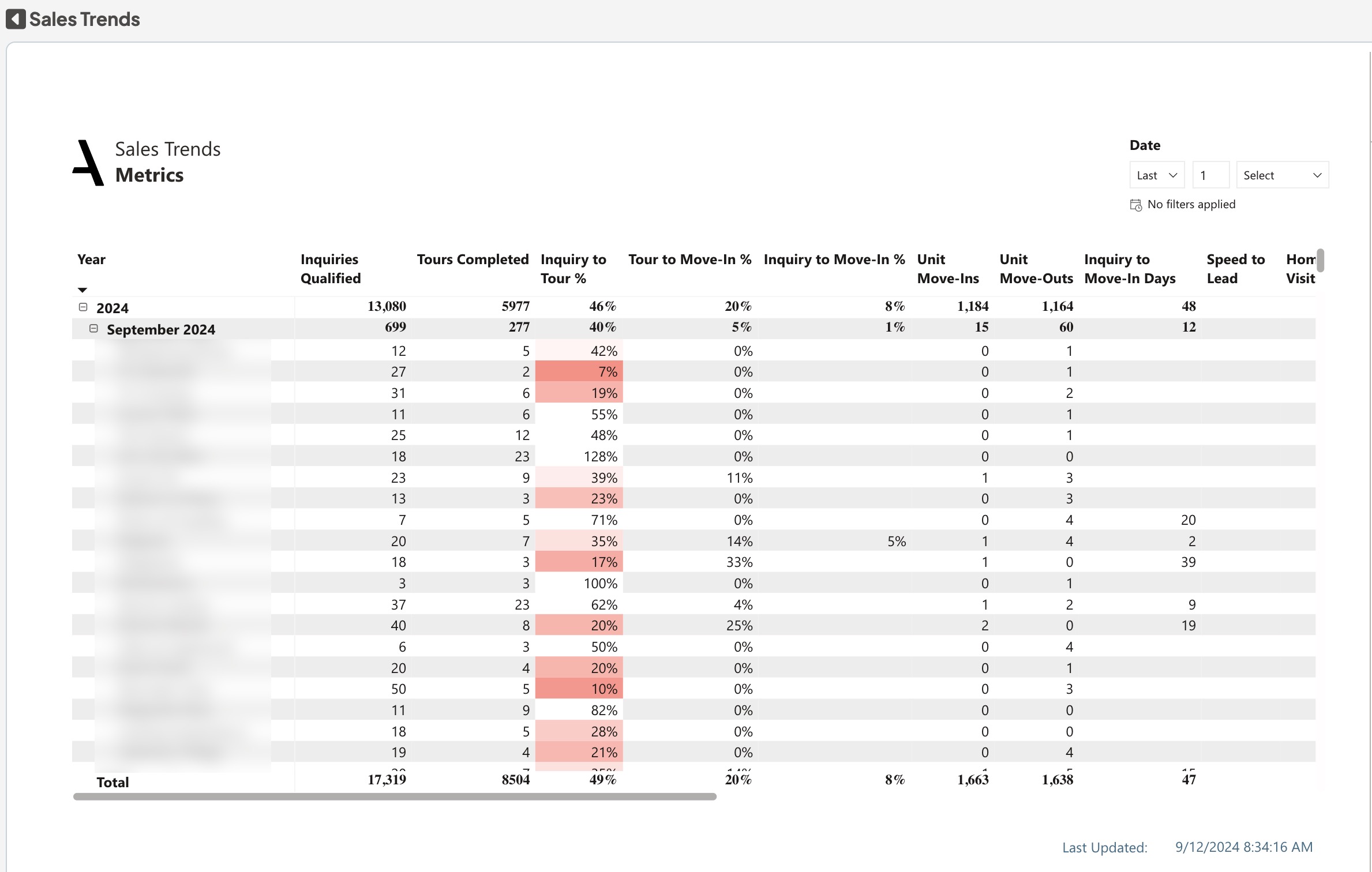 Sales Volume and Effectiveness: View data on Inquiries Qualified, Tours Completed and Inquiry to Tour % for each community to better understand your sales activities. Sales Pipeline Efficiency: Look into metrics like Inquiry to Move-in days and Speed to Lead to evaluate how quickly your sales process is moving. Community Health: Metrics such as Unit Move-Ins, Unit Move-Outs and Average Move-In Rate help you to gauge the health of your community occupancy.