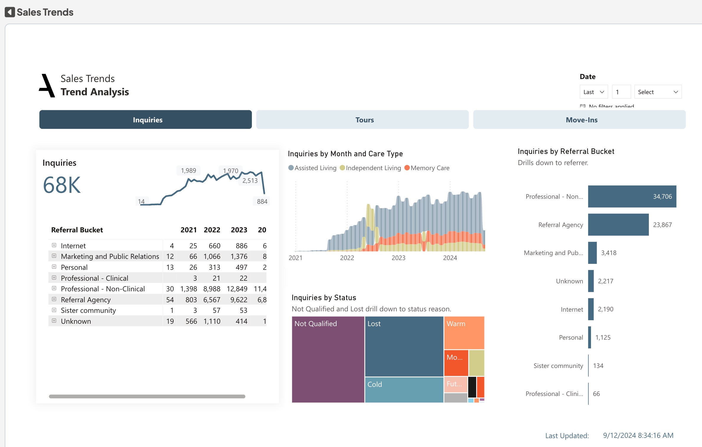 Multi-Faceted Analysis: Examine how different variables such as Referral Bucket and Referral Category impact Inquiries,Tours and Move-Ins. This enables better fine-tuning of your partnerships and marketing efforts.