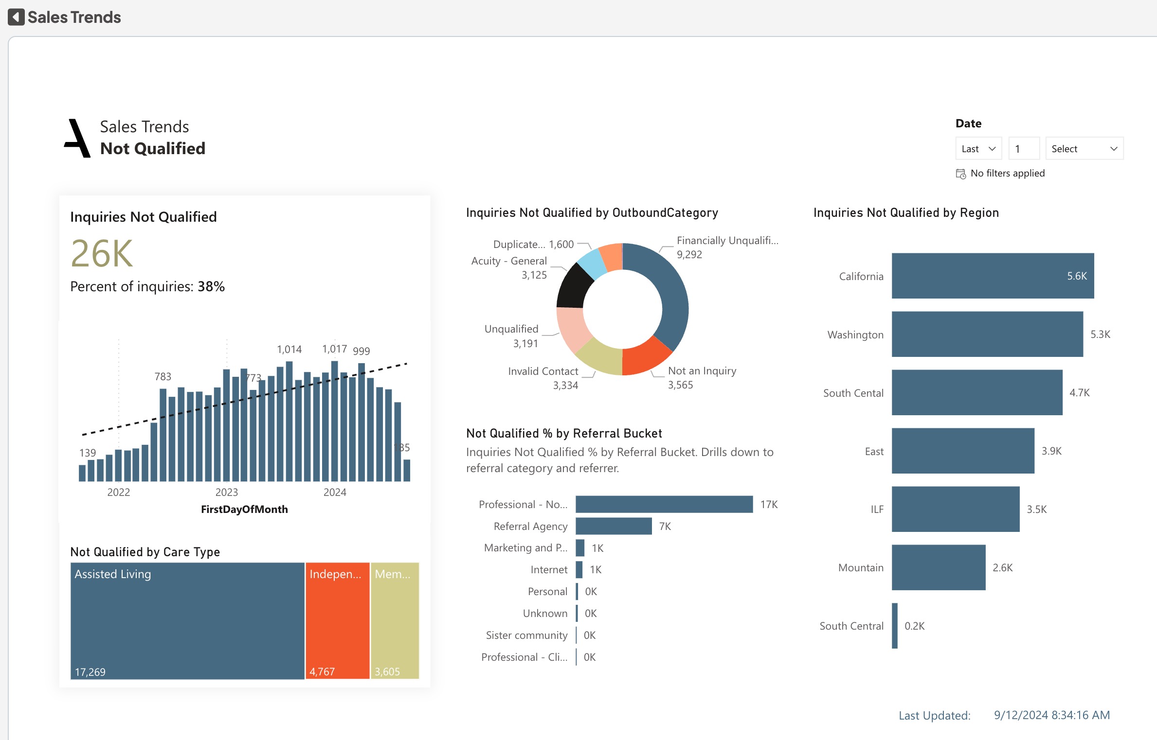 Analyze Monthly Trends: Examine the monthly percentages of leads that are Not Qualified, to identify patterns or shifts that may require attention. Care Type Desires: Explore how specific service desires and Not Qualified categories impact the volume of leads that are Not Qualified, informing potential adjustments to your pricing or marketing strategies. Identify Lead Sources: Use the bar chart to identify which referral agencies and Region are contributing a higher volume of Not Qualified leads.