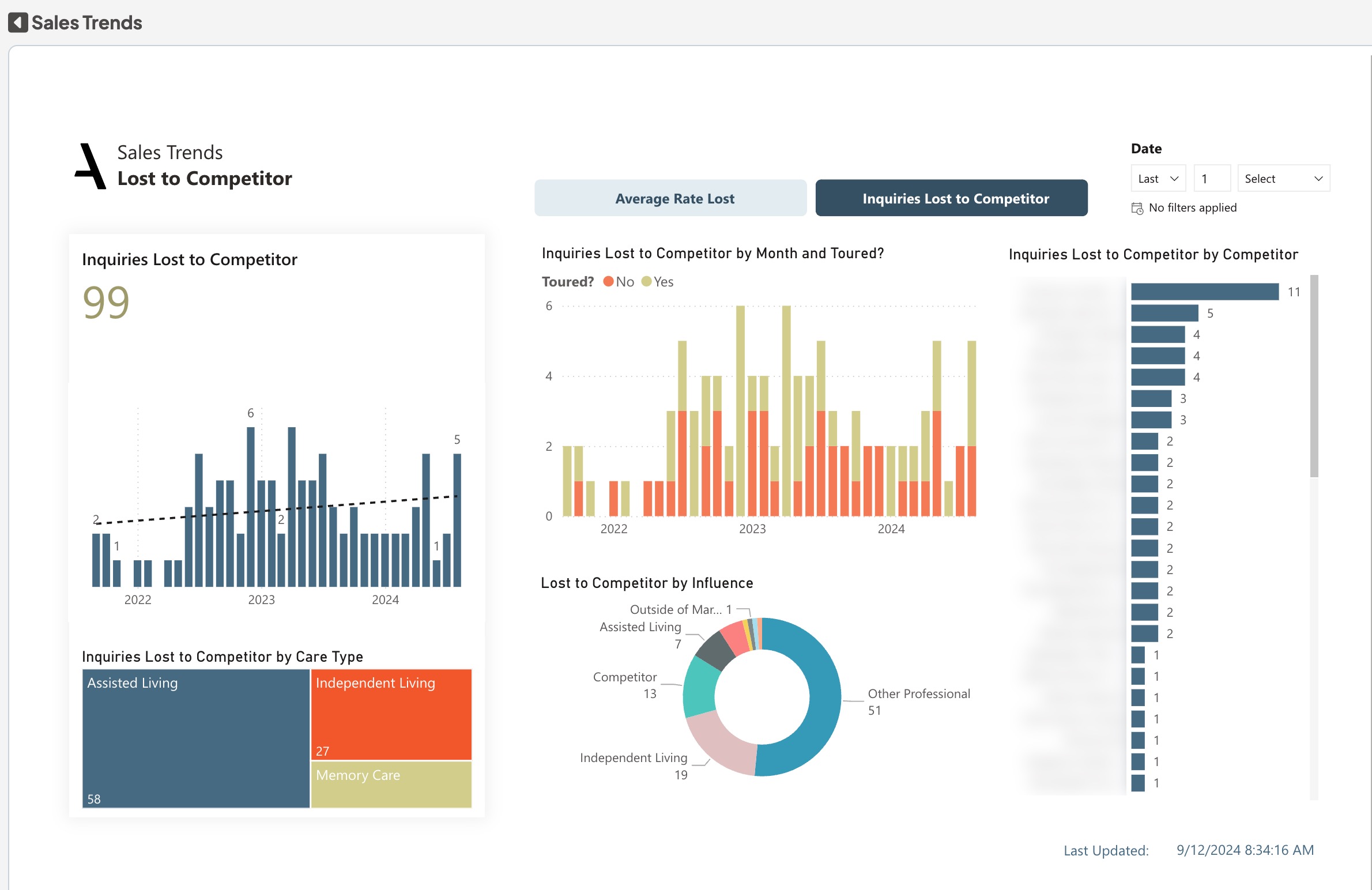 Service Impact: Discover which services are predominantly lost to competition via the "# Lost to Competitor by Care Type" chart. Competitor Leaderboard: Keep track of which competitors frequently secure inquiries that you lose.Average Rate Lost: Monitor the bar chart that displays the average rate lost by month, providing another dimension to your competitive analysis. Buttons in the top used to navigate the view to Average Rate Lost and Inquiries Lost to Competitor.