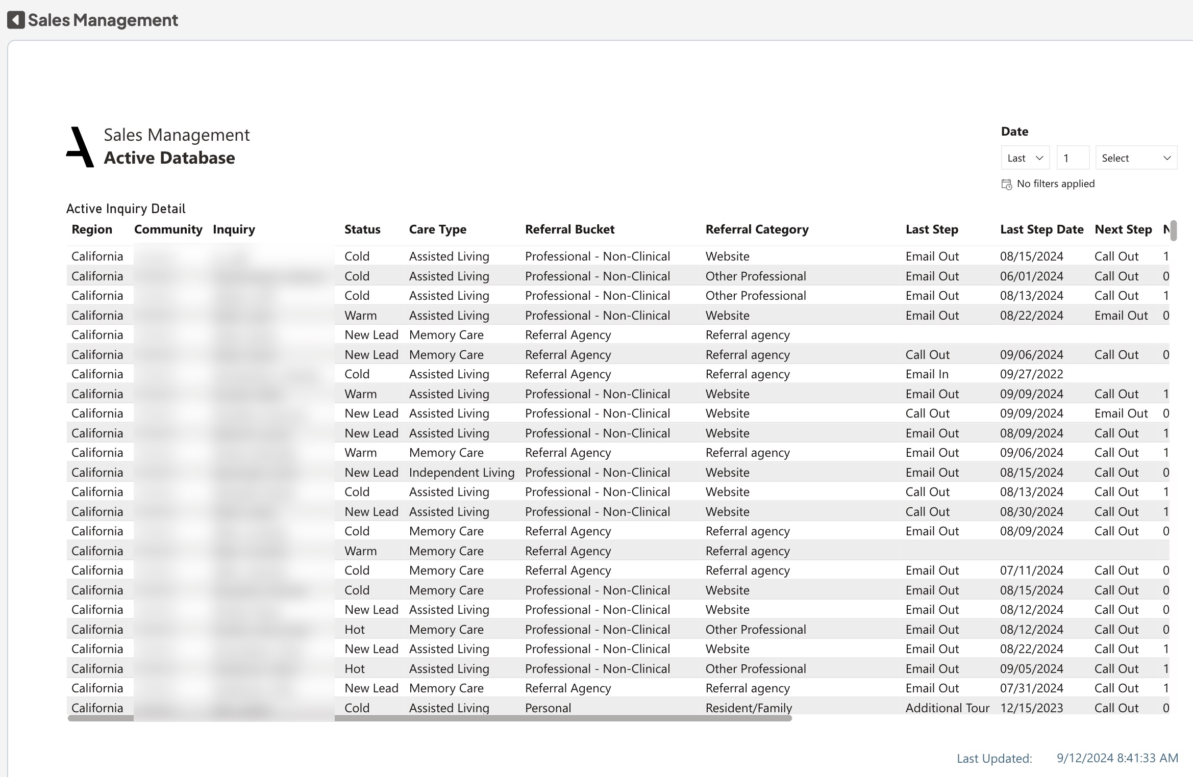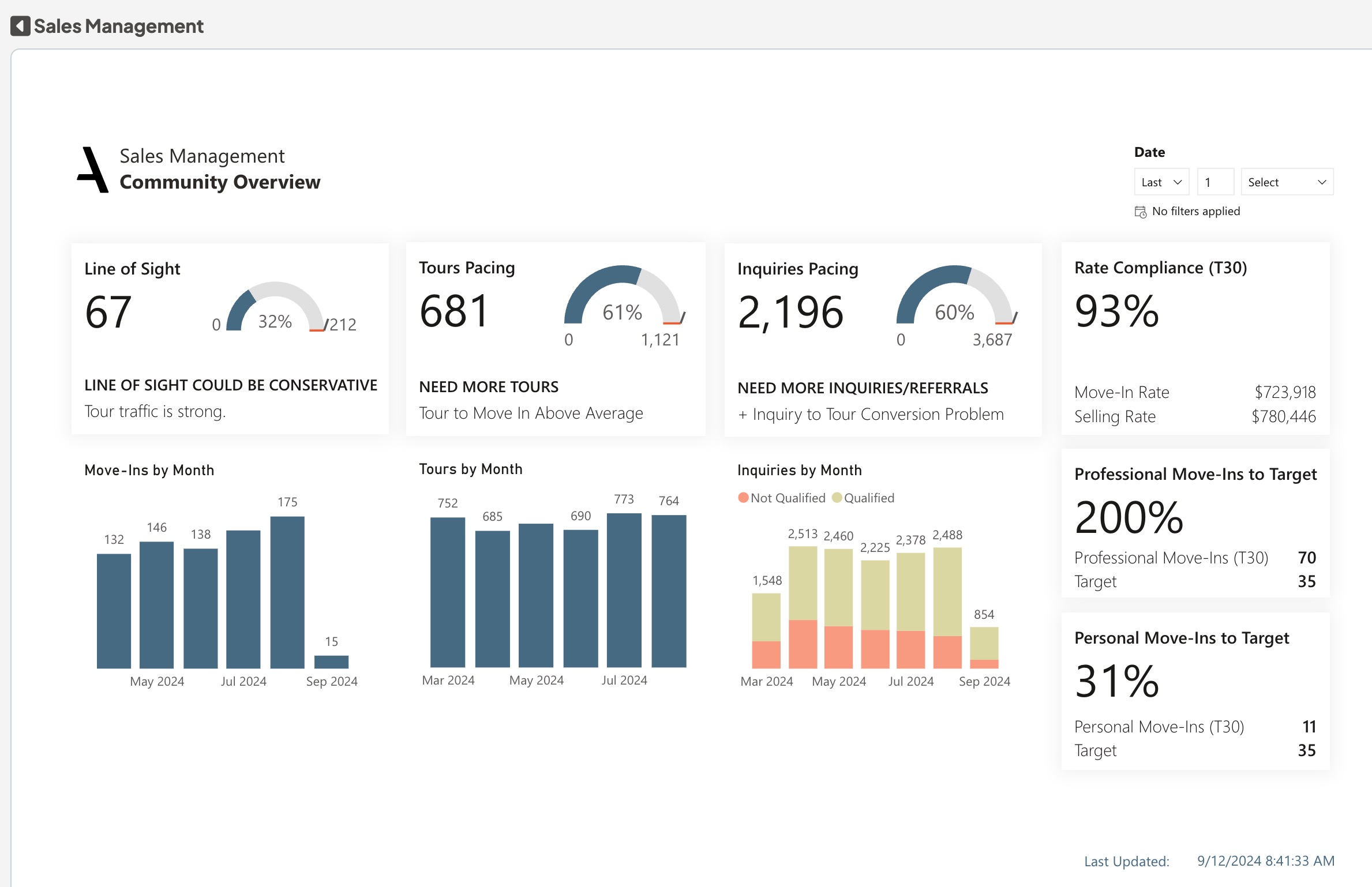 Sales Management reporting is designed for community-level users. The Sales Management app provides a daily snapshot of crucial metrics including a community's database, occupancy and other key factors, guiding staff on where to concentrate their efforts today.