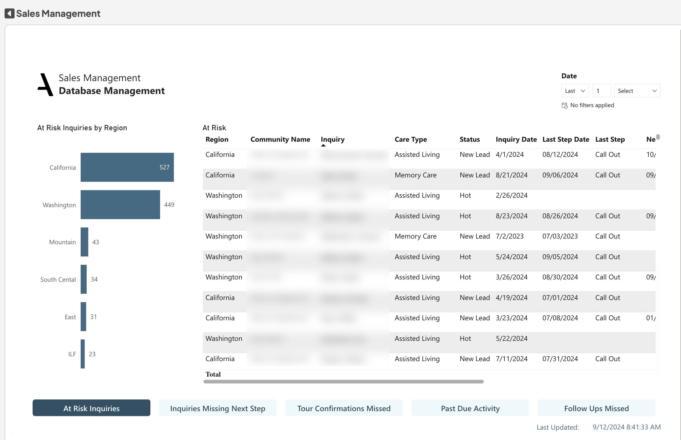 At Risk Inquiries: Hot, Closing and Reserved inquiries that have not be contacted in 7 days (AL/MC), 14 days (IL), or 21 days (Reserved at Unoccupied New Developments), as well as New Leads older than 14 days.