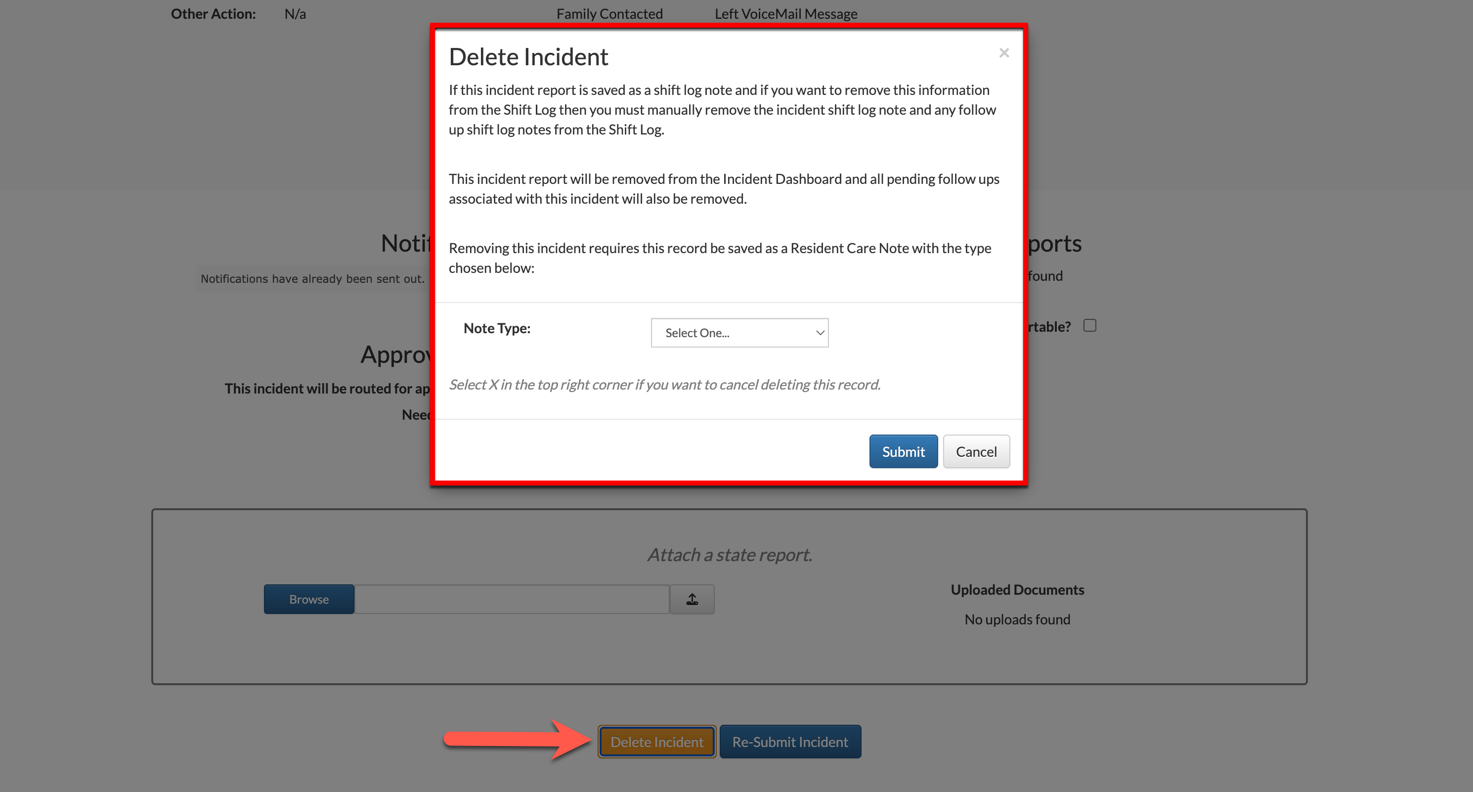 Deleting an Incident from the resident's Notes module will require the data to be saved under an alternative Note Type. Any previously scheduled follow ups will automatically be removed.