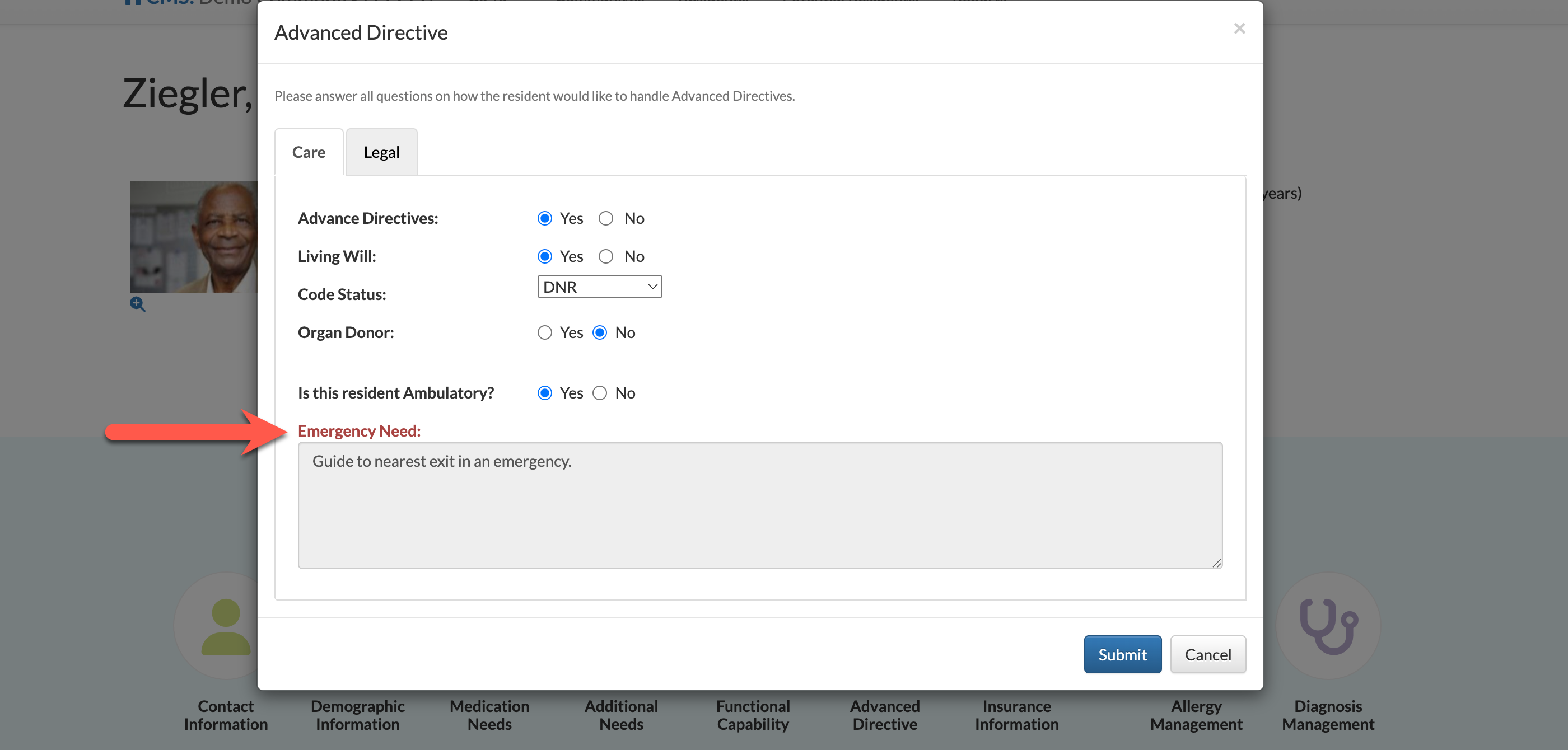 Emergency Needs entered via the Resident Assessment will now auto-populate on the resident profile and on the Emergency Needs report. Emergency Needs cannot be edited from the resident's Advanced Directives module and must be edited upon reassessment.