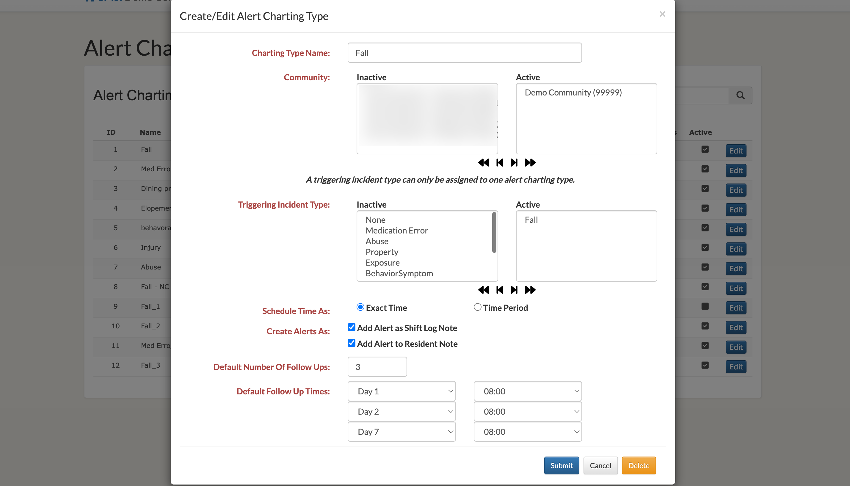 Alert Charting, or incident follow ups, can be attached to each specific incident type. For instance, a fall may require follow ups multiple times a day for multiple days whereas an elopement may only require a single follow up.