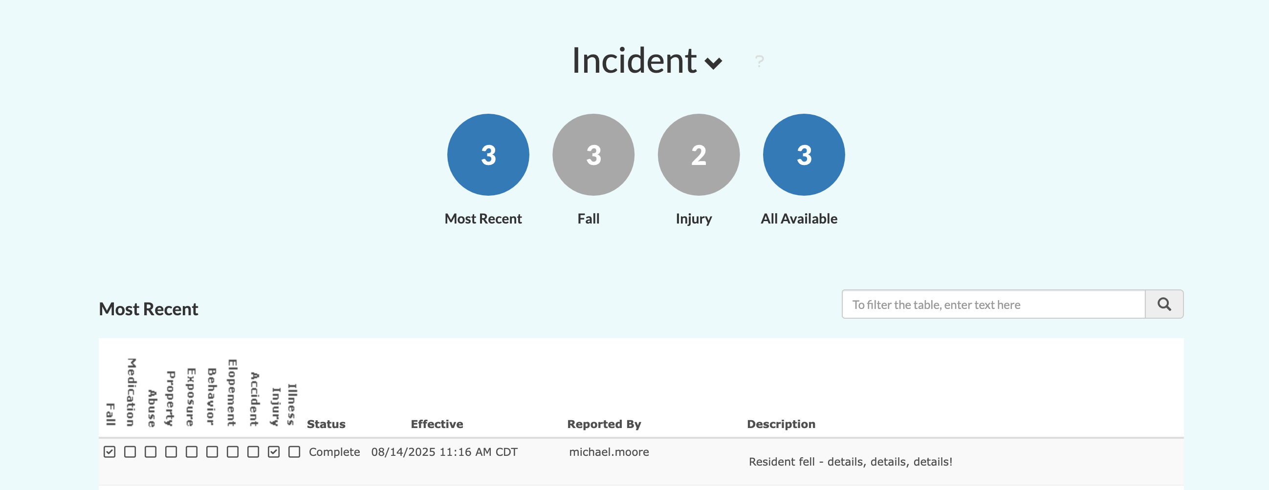 Let's take a look at how to work with Alert Charting. In the following example, we'll work with a resident who has had a recent fall reported as an incident. As you can see below, my Alert Charting for fall-type incidents is customized to require three follow ups - one on the first day, the second day, and then one week post-fall.