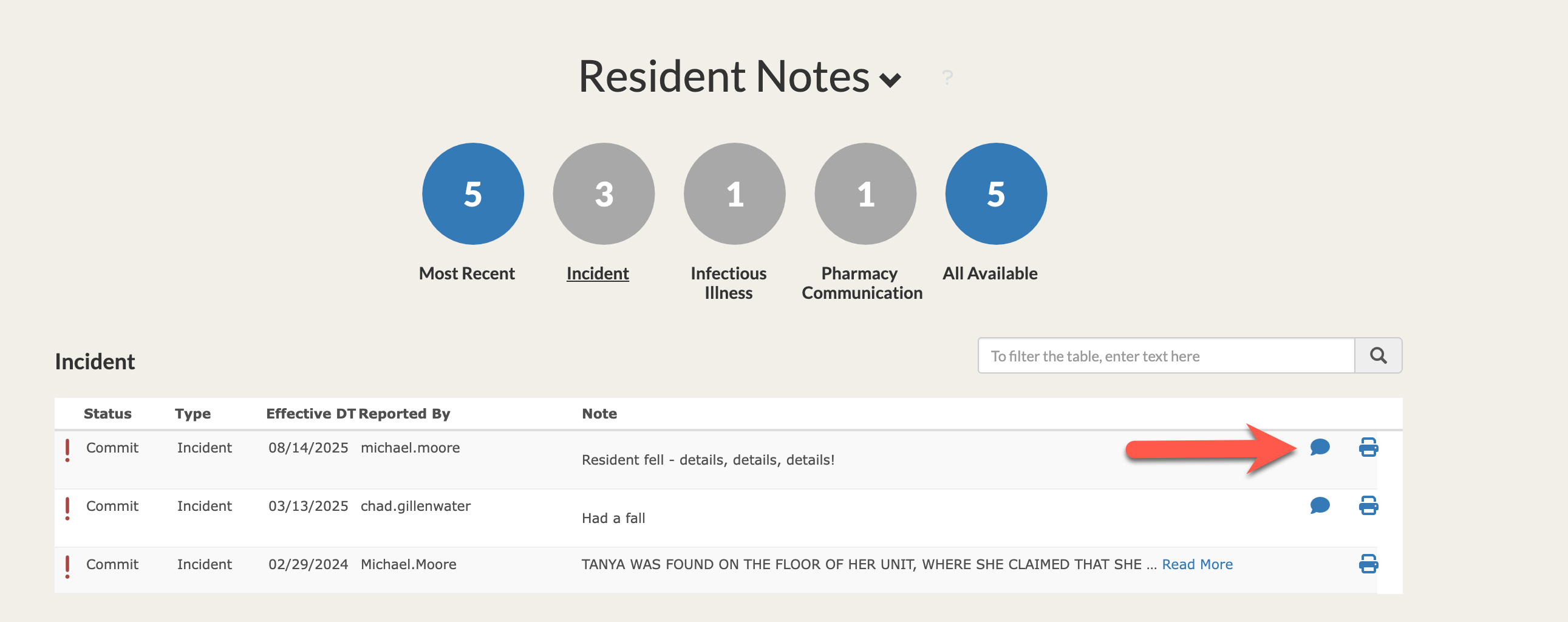 Alerts can appear as Resident Notes in the Aline Care application, as Shift Logs in the Aline CareMobile application, OR both simultaneously. In our example, we'll conduct the incident follow ups via Resident Notes.
