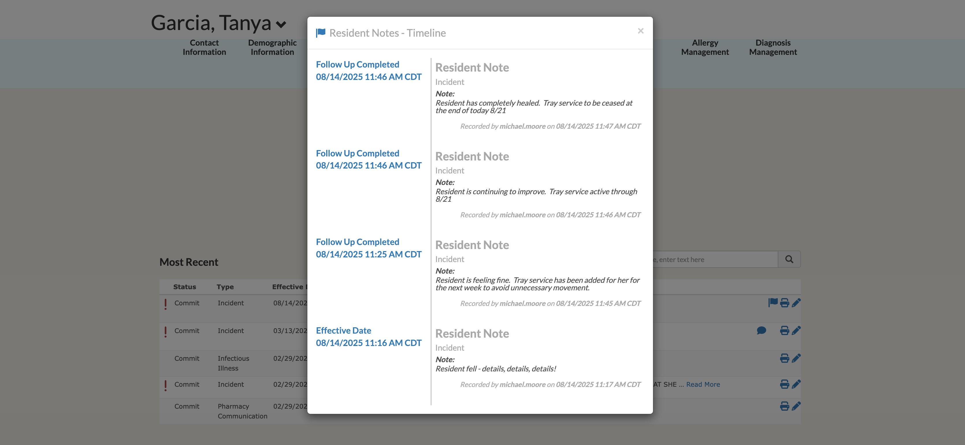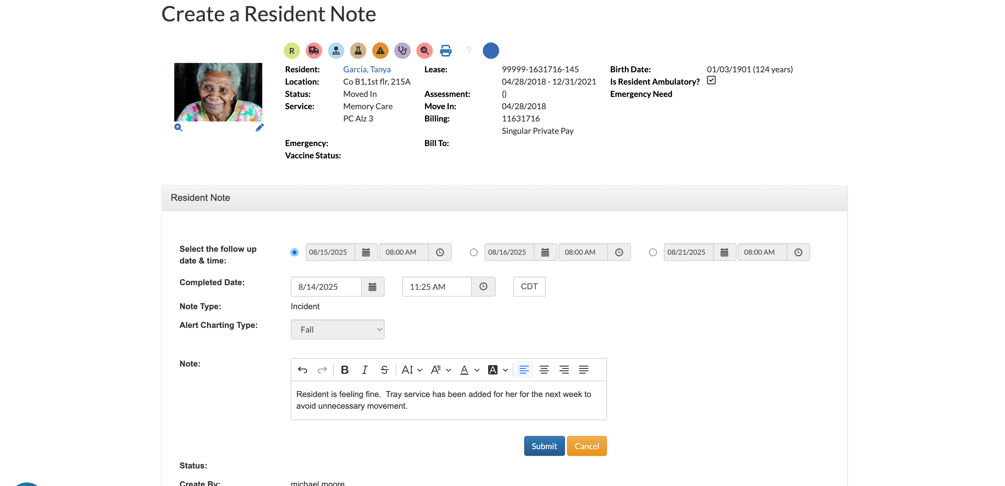 For instance, if a fall has taken place, perhaps the community's standard Alert Charting procedure dictates that check ins with the affected resident should take place twice daily for three days.