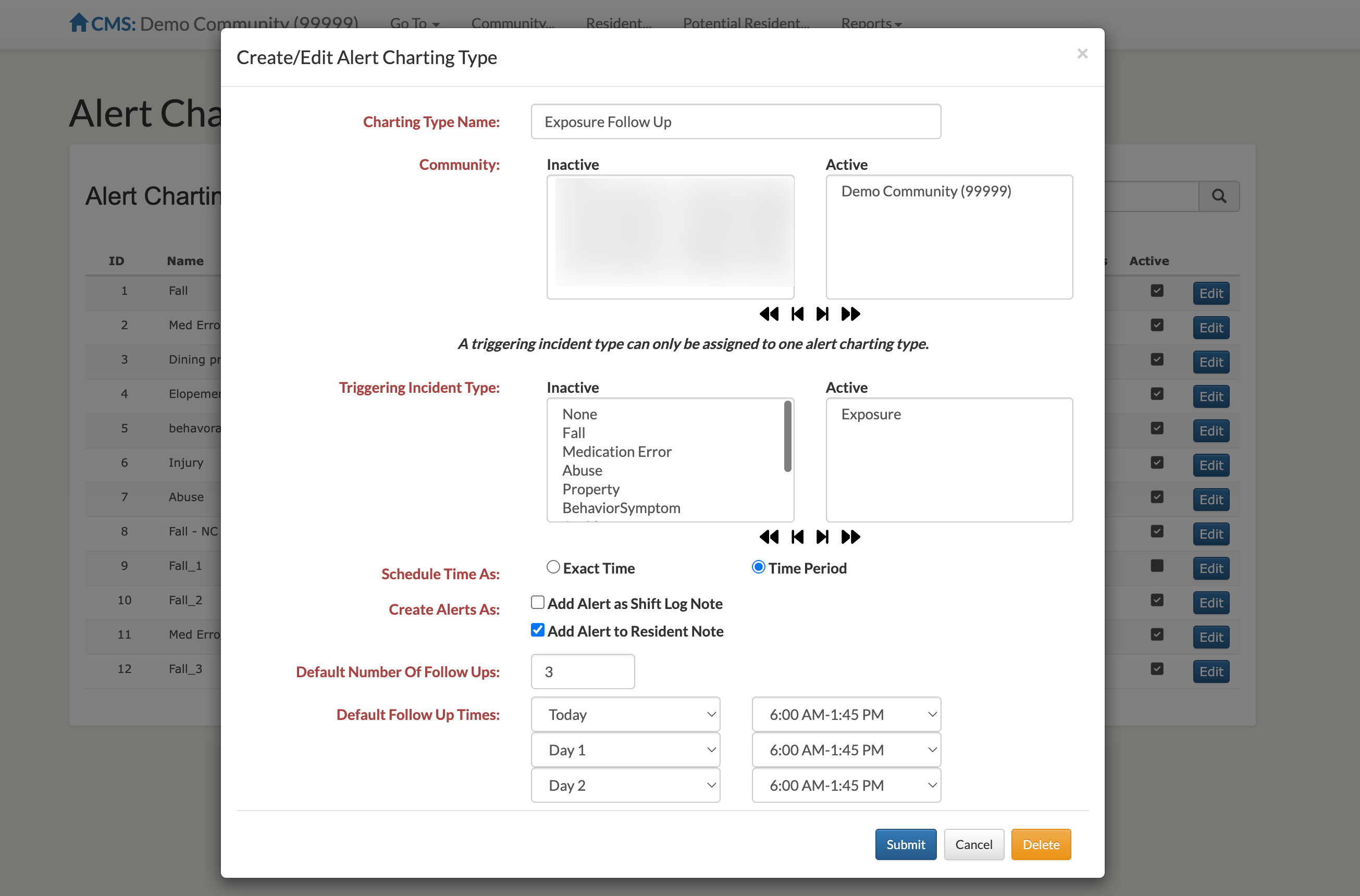 In this example, a user has created a new Alert Charting Type named Exposure Follow Up that applies solely to the Demo Community. The Alert Charting will trigger when an exposure incident is reported and will require a follow up in the Resident Notes section on the day of exposure, the day after exposure, and two days after exposure during the time range of the first shift.